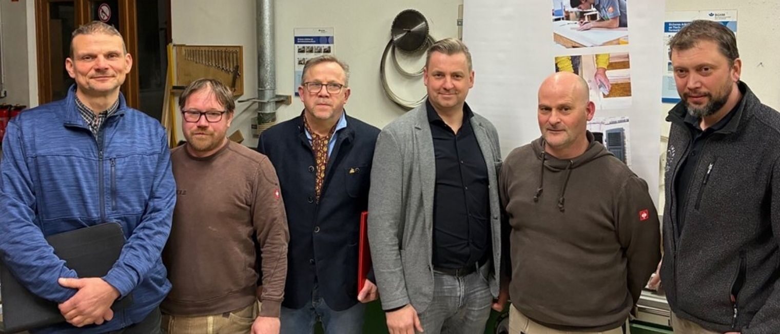 Einstimmig wählten die Mitglieder der Tischlerinnung Cottbus am 2. März 2026 den Forster Tischlermeister Thomas Kochan (3. v. r.) zum neuen Obermeister. Ebenso einstimmig wurden Tischlermeister Paul Schiementz (2. v. l.) und Stefan Nicklas (r.) neu in den Vorstand gewählt. Tischlermeister Ronald Erdmann (l.), Rodo Domann (3. v. l.) und Tischlermeister Matthias Baum (2. v. r.) unterstützen künftig weiterhin den Vorstand. Der langjährige Obermeister Matthias Jordan erhielt die Ernennung zum Ehrenobermeister.