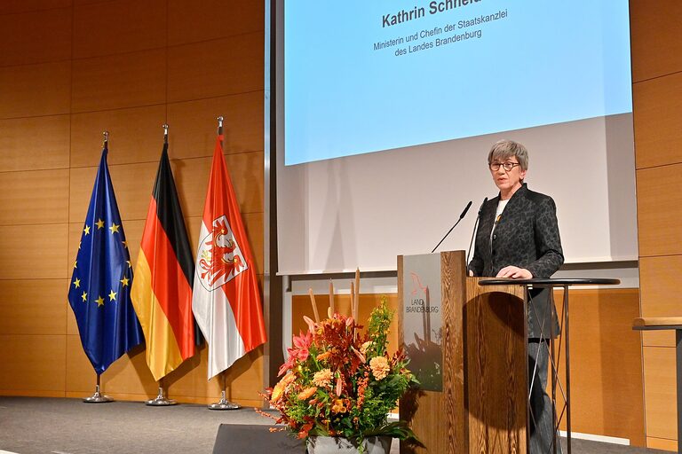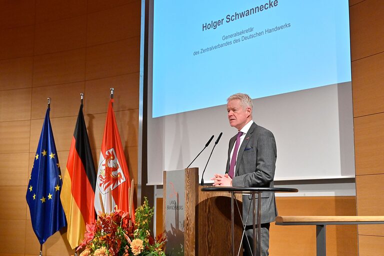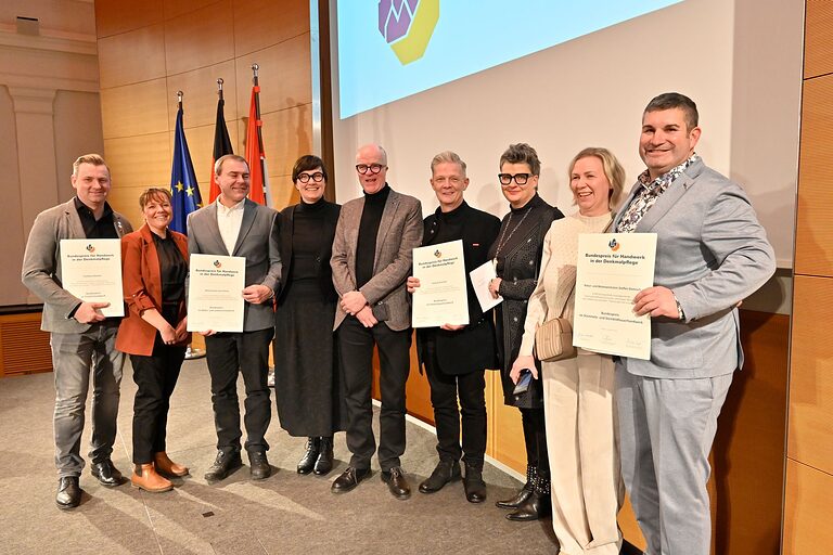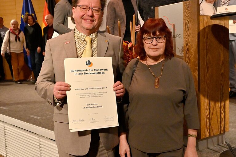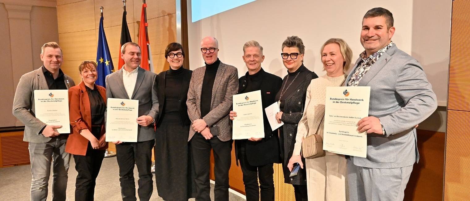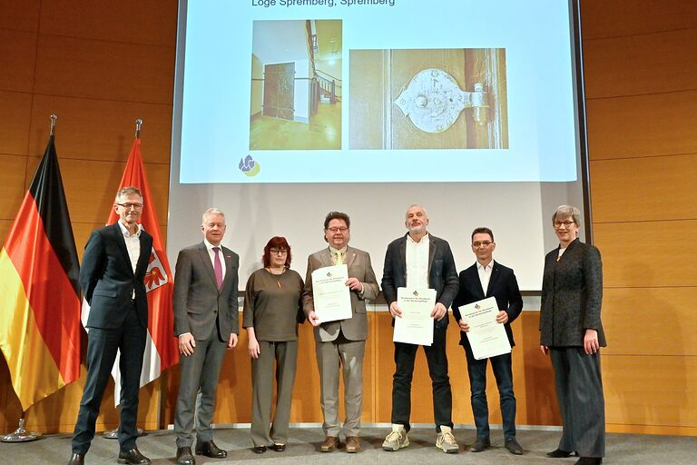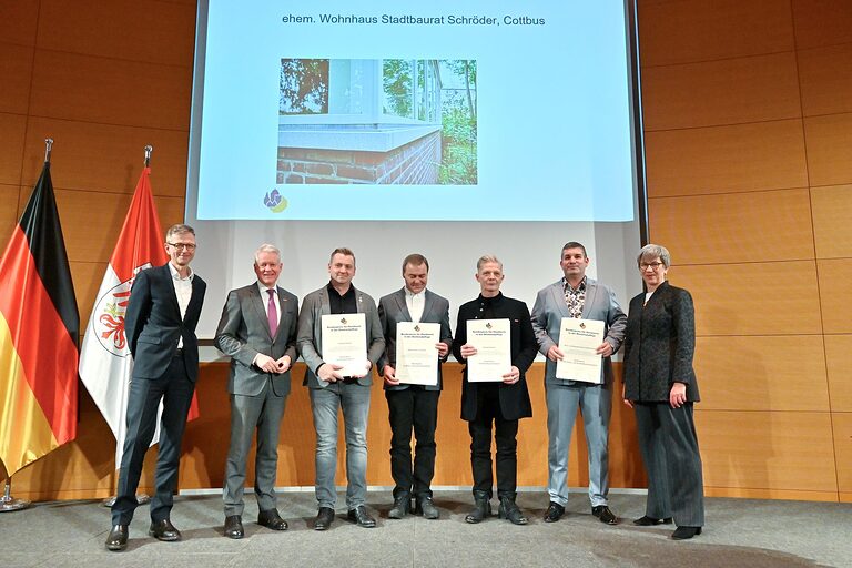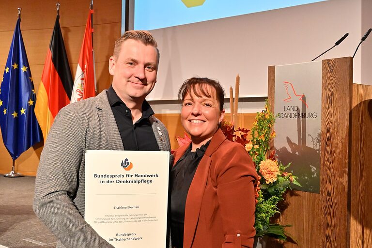 Mit dem „Bundespreis für Handwerk in der Denkmalpflege“ wurden am Donnerstag, den 27. November 2025 ,sechs Denkmaleigentümer und 46 Handwerker unterschiedlicher Gewerke aus Brandenburg ausgezeichnet. Die Festrede bei der Preisverleihung im Brandenburg Saal der Staatskanzlei des Landes Brandenburg hielt Ministerin Kathrin Schneider, Chefin der Staatskanzlei des Landes Brandenburg. Die Preisverleihung erfolgte zusammen mit dem Generalsekretär des Zentralverbandes des Deutschen Handwerks (ZDH), Holger Schwannecke, und Dr. Steffen Skudelny, Vorstand der Deutschen Stiftung Denkmalschutz. Der von der Stiftung gemeinsam mit dem Zentralverband gestiftete Preis wird jährlich in zwei Bundesländern an private Eigentümer verliehen, die bei der Bewahrung ihres Denkmals in Zusammenarbeit mit dem örtlichen Handwerk Herausragendes geleistet haben. Die an den Restaurierungsmaßnahmen beteiligten Handwerksbetriebe werden mit Ehrenurkunden ausgezeichnet, für die privaten Denkmaleigentümer ist der Bundespreis für Handwerk in der Denkmalpflege pro Bundesland mit jeweils 30.000 Euro dotiert. Im Jahr 2025 wurde der Preis in den Bundesländern Thüringen und Brandenburg ausgeschrieben, 2026 stehen Bremen und Nordrhein-Westfalen an.