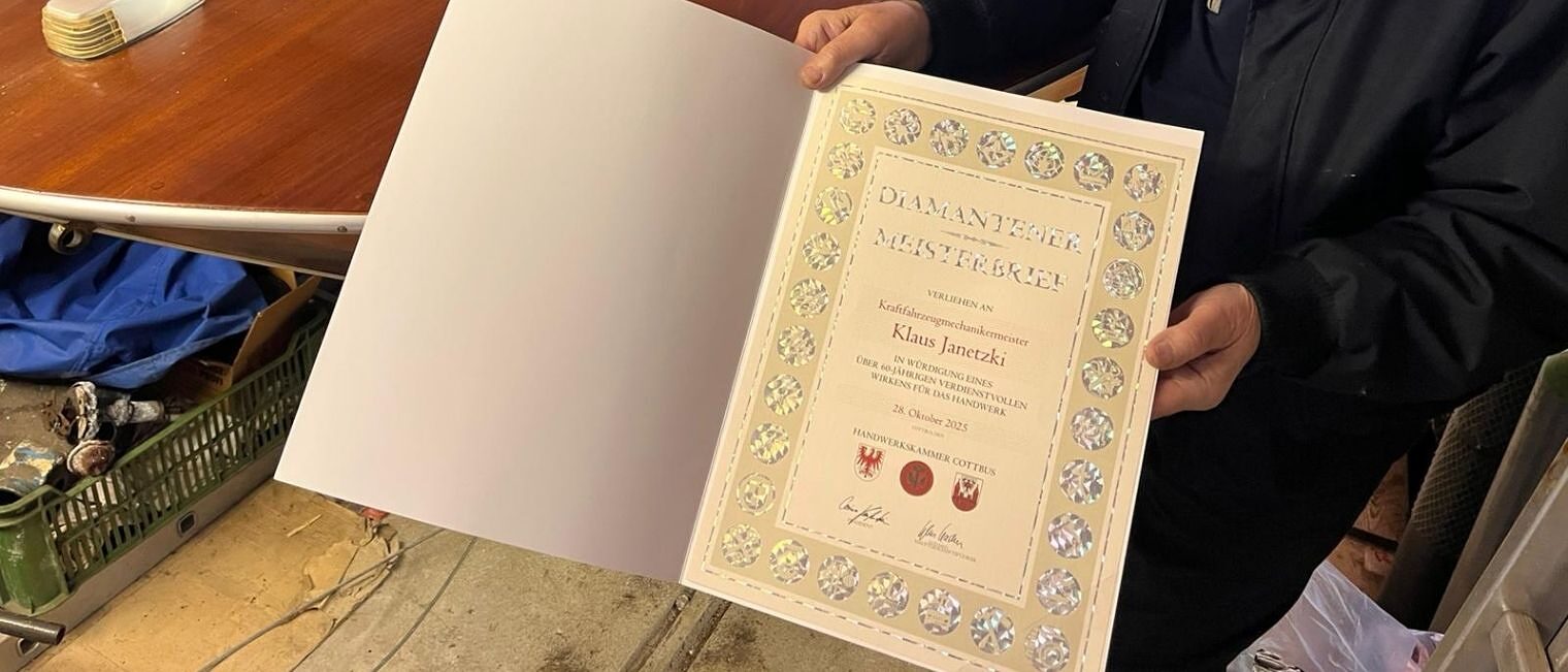 60-jähriges BetriebsjubiläumDiamantener Meisterbrief für Kraftfahrzeugmechanikermeister Klaus Janetzki