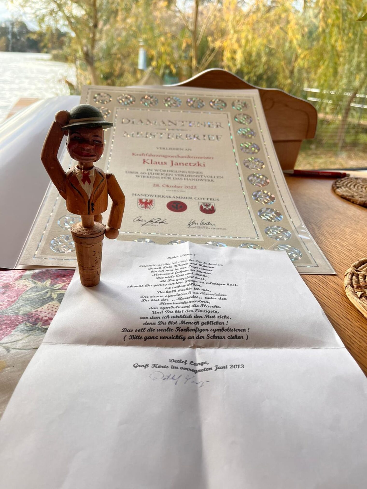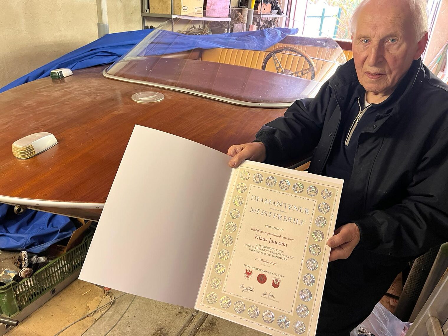 Groß Köris. Wenn Klaus Janetzki von Motoren spricht, dann glänzen seine Augen – so wie die frisch polierte Motorhaube eines Oldtimers. Seit über 60 Jahren schlägt sein Herz für das Kfz-Handwerk. Nun wurde dem Kraftfahrzeugmechanikermeister aus Groß Köris der Diamantene Meisterbrief verliehen – eine Auszeichnung für ein Lebenswerk voller Leidenschaft, Können und unermüdlicher Schaffenskraft.