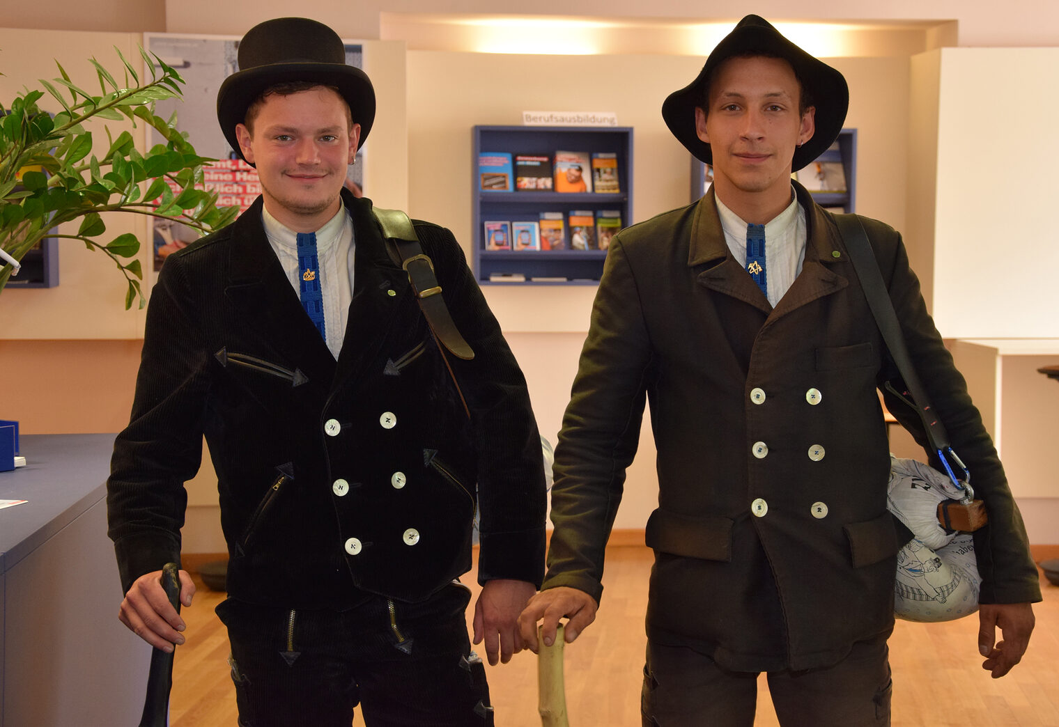 Zimmerer Lukas Weber und Dachdecker Andreas Bartl (beide 21) sind auf ihrer Walz-Tour bei der Handwerkskammer Cottbus eingekehrt. Seit einem Jahr sind die beiden Gesellen vom 126 Jahre alten Rolandschacht auf Wanderschaft.