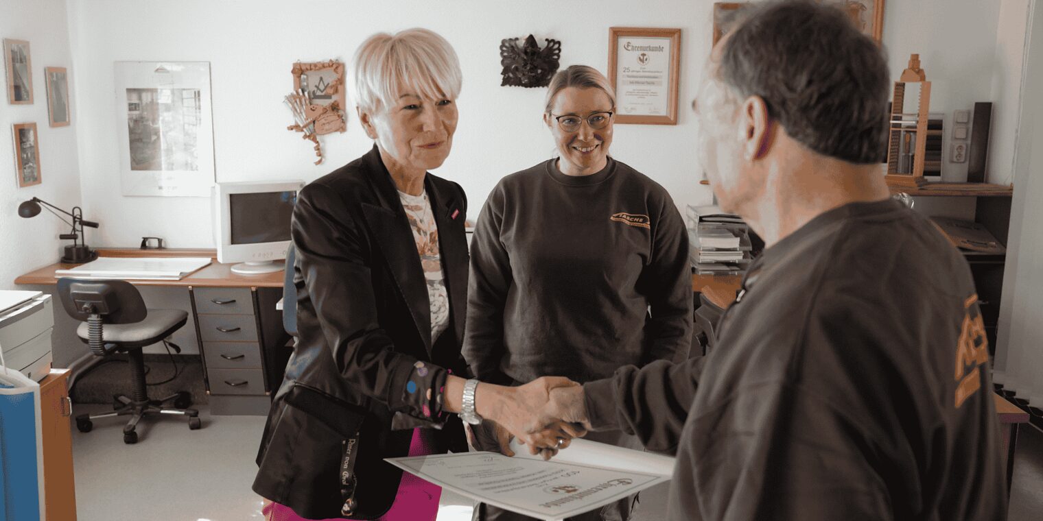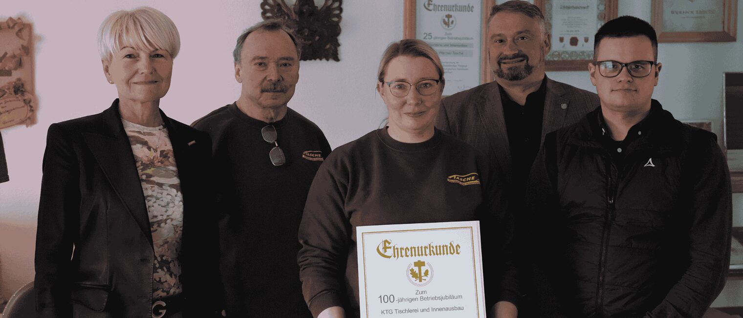 Handwerkskammer ehrt Traditionsbetrieb. Tochter Karen führt den Betrieb seit 2020 in vierter Generation.Was in einer kleinen Werkstatt begann - Ein Jahrhundert Tischlerei Tasche in Ruhland.