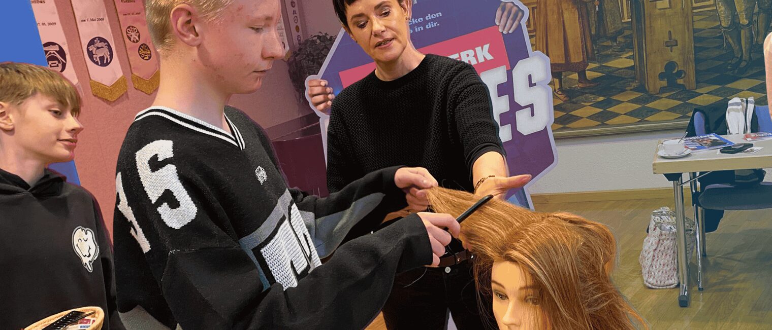 Im Meistersaal am Altmarkt stand das Friseurhandwerk im Mittelpunkt. Dort erhielten die Teilnehmenden Einblicke in aktuelle Trends und moderne Techniken. Unter fachkundiger Anleitung konnten sie anschließend selbst an Übungsköpfen arbeiten und erste praktische Erfahrungen sammeln.